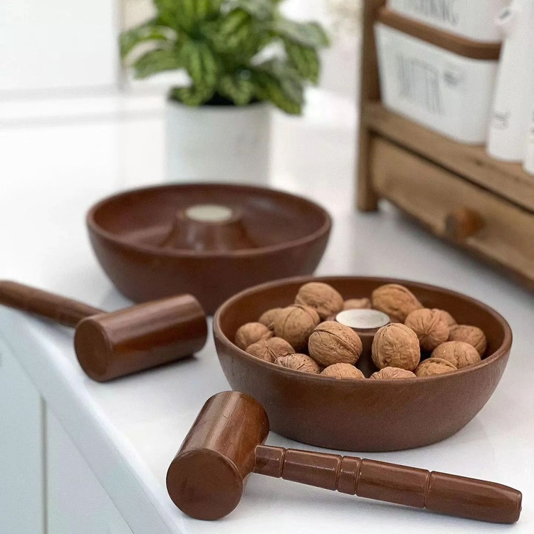 دارای یک چکش چوبی دارای یک فلز در مرکز سینی برای جلوگیری از آسیب به ظرف